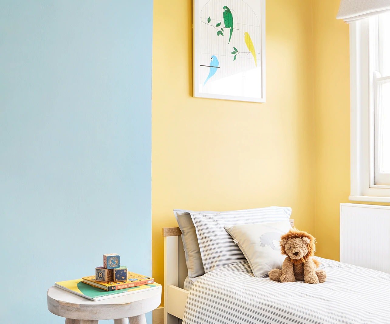 这种柔和的配色组合温暖而明亮。浅色调在房间墙壁周围反射光线,以营造出比深色涂料更清新、更明亮的效果。因此,这类颜色是托儿所或小型儿童房的理想墙壁配色。这些是经典的适合婴儿的颜色,因它们符合目的。此类颜色是柔软、俏皮和舒缓的漆色。其轻盈感非常适合白天的玩耍时光,而舒缓的底色则有助于在重要的睡眠时间感到放松。Mylands(麦兰德)的Golden Square™ No.131(黄金广场™ 131号)是用于儿童卧室墙壁的黄色涂料。如下图所示,它具有橙色底色,增添了金黄色的温暖及俏皮感。